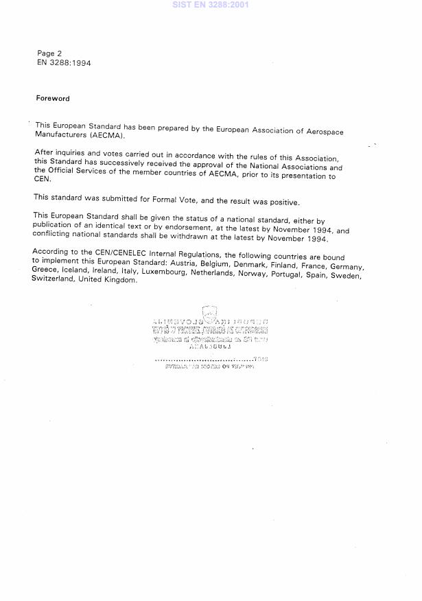 Consult the issuing organization (CEN) or national adoption documents (e.g., SIST EN 3288:2001) for official status, amendments, and detailed normative references.