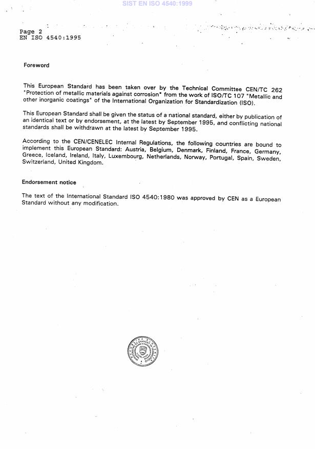 EN ISO 4540:1995 is a standard published by the European Committee for Standardization (CEN). Its full title is "Metallic coatings - Coatings cathodic to the substrate - Rating of electroplated test specimens subjected to corrosion tests (ISO 4540:1980)". This standard covers: In dieser Internationalen Norm ist ein Bewertungsverfahren für den Zustand galvanisch beschichteter Proben, die zu Prüfzwecken korrodierenden Medien ausgesetzt wurden, festgelegt. Es stützt sich auf die Erfahrungen, die bei dem Verfahren mit genormten Prüfplatten von 10 cm x 15 cm gewonnen wurden; die auf Gestellen auf einem Freiluftprüfstand der natürlichen Atmosphäre ausgesetzt werden.