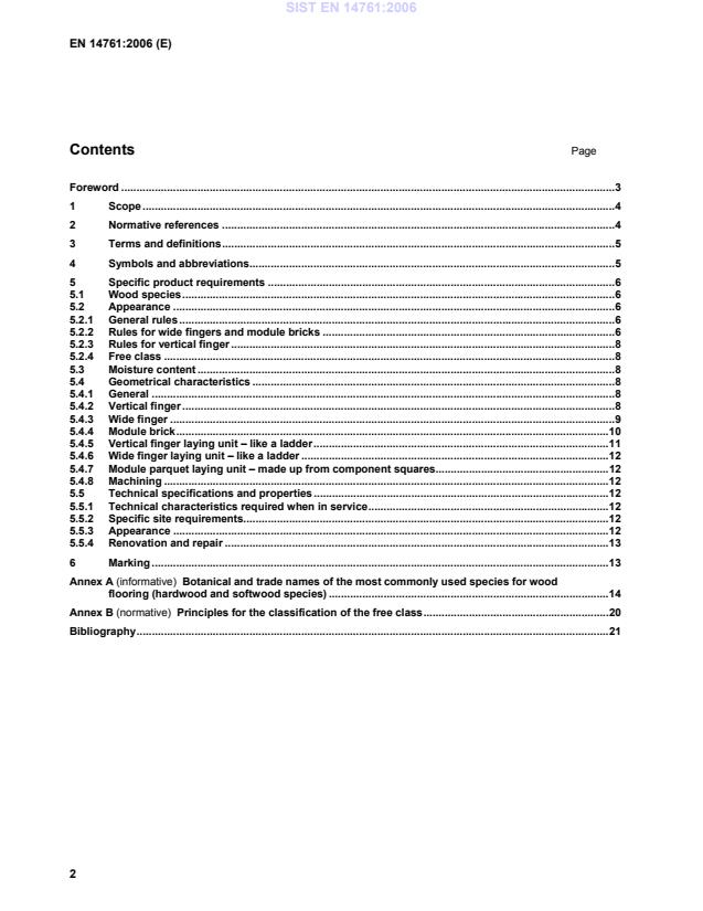 1 Scope This European Standard specifies the characteristics of solid vertical and wide finger as well as Module brick including the laying units made of softwood or hardwood for internal use as flooring. This standard covers products without surface treatments. This standard covers also treated or untreated elements. 2 Normative references The following referenced documents are indispensable for the application of this document. For dated references, only the edition cited applies. For undated references, the latest edition of the referenced document (including any amendments) applies. EN 844-1:1995, Round and sawn timber – Terminology – Part 1 : General terms common to round timber and sawn timber EN 844-3:1995, Round and sawn timber – Terminology – Part 3 : General terms relating to sawn timber EN 844-4:1997, Round and sawn timber – Terminology – Part 4 : Terms relating to structure content EN 844-6:1997, Round and sawn timber – Terminology – Part 6 : Terms relating to dimensions of sawn timber EN 844-7:1997, Round and sawn timber – Terminology – Part 7 : Terms relating to anatomical structure of timber EN 844-9:1997, Round and sawn timber – Terminology – Part 9 : Terms relating to features of sawn timber EN 844-10:1998, Round and sawn timber – Terminology – Part 10 : Terms relating to stain and fungal attack EN 844-11:1998, Round and sawn timber – Terminology – Part 11 : Terms relating to degrade by insects EN 844-12:2000, Round and sawn timber – Terminology – Part 12 : Additional terms and general index EN 1310, Round and sawn timber – Method of measurement of features EN 1534, Wood and parquet flooring - Determination of resistance to indentation (Brinell) - Test method EN 13183-1, Moisture content of a piece of sawn timber - Part 1: Determination by oven dry method EN 13183-2, Moisture content of a piece of sawn timber - Part 2: Estimation by electrical resistance method EN 13647, Wood and parquet flooring and wood panelling and cladding - Determination of geometrical characteristics EN 13756:2002, Wood flooring – Terminology EN 14342, Wood flooring – Characteristics, evaluation of conformity and marking SIST EN 14761:2006