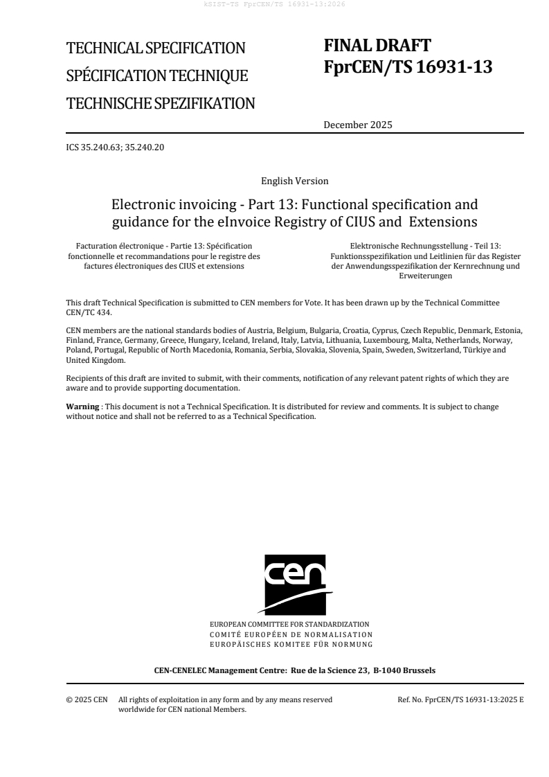 FprCEN/TS 16931-13 is a draft published by the European Committee for Standardization (CEN). Its full title is "Electronic invoicing - Part 13: Functional specification and guidance for the eInvoice Registry of CIUS and Extensions". This standard covers: This document defines the purpose, governance and functional requirements of the eInvoicing Registry for CIUS and Extension Specifications. This document is not to be confused with other business / project focused Technical Specifications. It follows CEN rules and will be published as a CEN document with normative statements. A key part of this document is to provide a functional specification, which will describe the various functions of eInvoice Registry Services. The Registry is intended to serve as a structured, transparent and publicly accessible repository that facilitates the discovery, registration and management of eInvoicing Specifications that either restrict the conditional elements of the Core Invoice Model and/or extend it in conformance with Part 5 Extension Methodology. The scope of this document includes: - Definition of Registry Services - the structure and capabilities of the Registry including the types of artefacts it stores or references, e.g. CIUS, Extension Specifications, Validation Artefacts and Services, and Code Lists; - Governance Model - the roles and responsibilities of entities involved in managing and maintaining the Registry; - Submission and Verification Processes - how Specifications are submitted, reviewed and verified for inclusion in the Registry; - Functional Specification - the required functionality, processes and procedures that enable the Registry to operate efficiently.