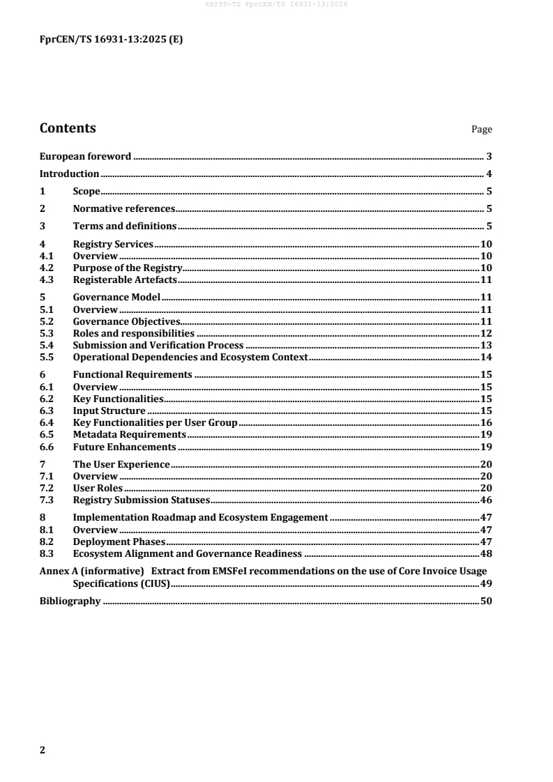This document defines the purpose, governance and functional requirements of the eInvoicing Registry for CIUS and Extension Specifications. This document is not to be confused with other business / project focused Technical Specifications. It follows CEN rules and will be published as a CEN document with normative statements. A key part of this document is to provide a functional specification, which will describe the various functions of eInvoice Registry Services. The Registry is intended to serve as a structured, transparent and publicly accessible repository that facilitates the discovery, registration and management of eInvoicing Specifications that either restrict the conditional elements of the Core Invoice Model and/or extend it in conformance with Part 5 Extension Methodology. The scope of this document includes: - Definition of Registry Services - the structure and capabilities of the Registry including the types of artefacts it stores or references, e.g. CIUS, Extension Specifications, Validation Artefacts and Services, and Code Lists; - Governance Model - the roles and responsibilities of entities involved in managing and maintaining the Registry; - Submission and Verification Processes - how Specifications are submitted, reviewed and verified for inclusion in the Registry; - Functional Specification - the required functionality, processes and procedures that enable the Registry to operate efficiently.