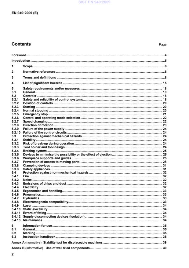 EN 940:2009 is a standard published by the European Committee for Standardization (CEN). Its full title is "Safety of woodworking machines - Combined woodworking machines". This standard covers: This document deals with the significant hazards, hazardous situations and events as listed in Clause 4 which are relevant to stationary and displaceable combined woodworking machines with two or more of only the following integrated units: - surface planing, - circular sawing (working simultaneously or not with vertical spindle moulding unit), - vertical spindle moulding, - boring [mortising] and - thickness planing hereinafter referred to as machines, designed to cut solid wood, chipboard, fibreboard, plywood, and also these materials where they are covered with plastic laminates or edging or veneer, when they are used as intended and under the conditions foreseen by the manufacturer. NOTE 1 For the definitions of stationary and displaceable machine see 3.12 and 3.13. NOTE 2 The specific requirements on demountable power feed unit will be considered during next revision of this document. This document does not apply to: - combined machines which consist only of a surface planing unit and a thickness planing unit; NOTE 3 Combined machines consisting of only of a surface planing unit and a thickness planing unit are dealt with in EN 861:2007. - combined machines with a band saw unit; - transportable motor-operated electric combined tools, or any adaptation permitting their use in a different mode, i.e. bench mounting; NOTE 4 Transportable motor-operated electric combined tools are covered by the requirements of EN 61029-1:2000 and EN 61029-2-11:2003. - machines with mortising unit driven by a separate motor. This document is not applicable to combined woodworking machines which are manufactured before the date of its publication as EN. NOTE 5 Machines covered by this European Standard are listed under A.5 of Annex IV of the Machinery Directive 98/37/EC and under 5 of Annex IV of Machinery Directive 2006/42/EC.