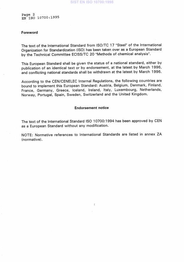 - ISO 377‑2 (sampling of steels), ISO 3696 (water for analytical use), ISO 385‑1 / ISO 648 / ISO 1042 (volumetric glassware) and ISO 5725 (precision of test methods) are referenced for sampling, reagent and precision requirements linked to EN ISO 10700.
