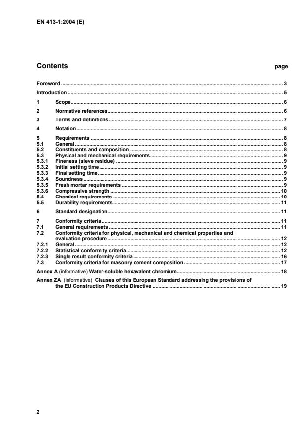 This European Standard gives the definition and composition of masonry cements as commonly used in Europe for the production of mortar for bricklaying and blocklaying and for rendering and plastering. It includes physical, mechanical and chemical requirements and defines strength classes. prEN 413-1 also states the conformity criteria and the related rules. Necessary durability requirements are also given. NOTE For normal applications the information given in prEN 413-1, in EN 998-1 and in EN 998-2 is generally sufficient. However, in special cases, an exchange of additional information between the masonry cement producer and user can be helpful. The details of such an exchange are not within the scope of prEN 413-1 but should be dealt with in accordance with national standards or other regulations or can be agreed between the parties concerned.