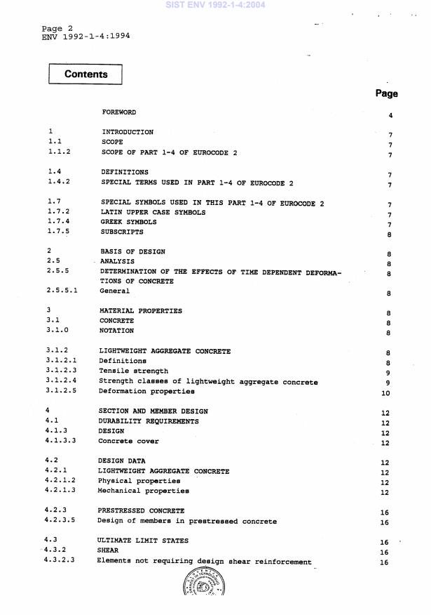 ENV 1992-1-4:1994 is a standardization document published by the European Committee for Standardization (CEN). Its full title is "Eurocode 2: Design of concrete structures - Part 1-4: General rules - Lightweight aggregate concrete with closed structure". This standard covers: Migrated from Progress Sheet (TC Comment) (2000-07-10): Splitting of WI 13. Dates refer to ENV. ++ 2-Y-Review (therefore re-use of old WI and use of stage 41).