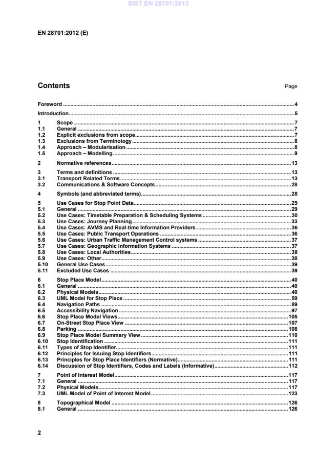 The informative XML XSD schema appended to this document gives an example of serialisation into useful packages. 1.5.4 Stop Identification and Labelling A particular use of Fixed Object model data is to enable stop and place finding by users of journey planners and other on-line applications. This requires the appropriate association of entities with topographical places. The Model is designed to allow for meaningful codes and labels to be constructed according to many different application and usage contexts. 1.5.5 Relationship to GIS Standards The Fixed Object model has a relationship to other standards describing the geographical features of a country, but is not itself a GIS standard. The Fixed Object model describes the semantic structure of stop places in a way that can be related to the public transport universe of discourse of Transmodel. Transmodel and the Fixed Object model exclude the detailed description of geographic features, and use standard GIS model elements to describe the GDF references needed to relate the Fixed Object model entities to the underlying GIS models. The Location models used in the Fixed Object need to be represented in a way such that they can be projected onto a variety of geospatial representations. The Fixed Object model upholds the principles from Transmodel of separation of information layers and the use of Point and Link representations within the distinct layers which can be used to project elements between the models. Point and Link and address data sufficient to make this projection are included in Fixed Objects: the choice of coordinate reference systems is open. SIST EN 28701:2013