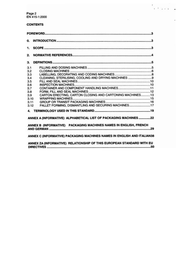 EN 415-1:2000 is a standard published by the European Committee for Standardization (CEN). Its full title is "Packaging machines safety - Part 1: Terminology and classification of packaging machines and associated equipment". This standard covers: This European standard defines the field of packaging machines in detail in clause 3, but briefly these are: Filling and Dosing machines; closing machines; labelling, decorating and coding machines; cleaning, sterilising, cooling and drying machines; fill and seal machines; inspection machines; container and component handling machines; form, fill and seal machines; cartoning machines; wrapping machines; group or transit packaging machines; pallet or loading unit forming, dismantling and securing machines.