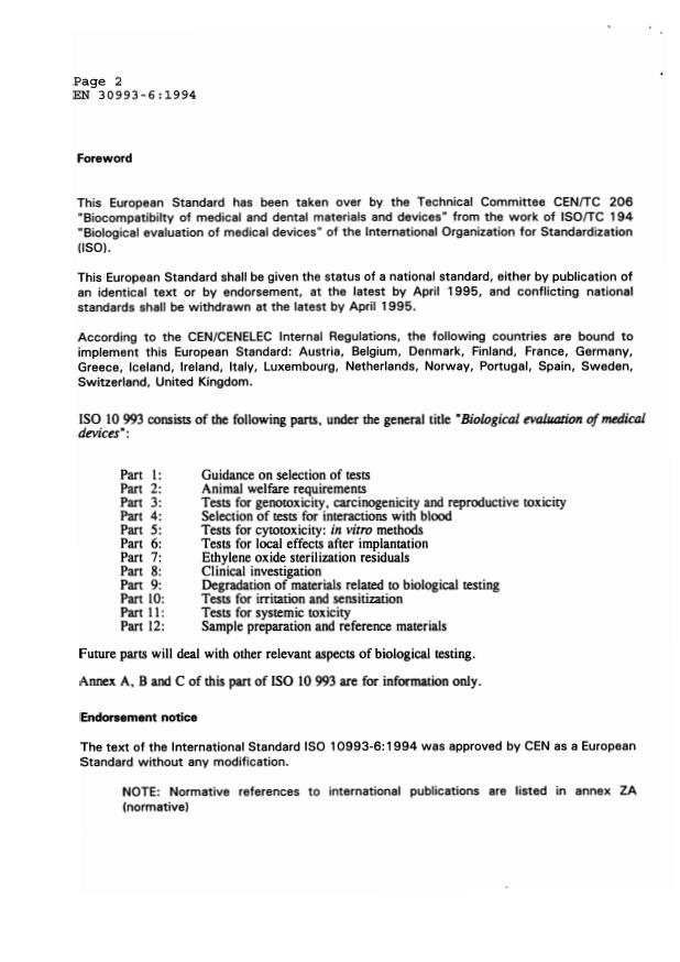 EN 30993-6:1994 is a standard published by the European Committee for Standardization (CEN). Its full title is "Biological evaluation of medical devices - Part 6: Tests for local effects after implantation (ISO 10993-6:1994)". This standard covers: This part of ISO 10993 specifies test methods for the assessment of the local effects of an implant material on living tissue, at both the macroscopic and microscopic level. The test specimen is implanted into a site and tissue appropriate for evaluation of the biological safety of the material. The implant is not intended to be subjected to mechanical or functional loading. The local effects are evaluated by a comparison of the tissue response caused by a test specimen to that caused by materials used in medical devices whose clinical acceptability has been established. The test methods for local effects after implantation are used to assess subchronic effects (short-term, up to 12 weeks), or chronic effects (long-term, longer than 12 weeks).