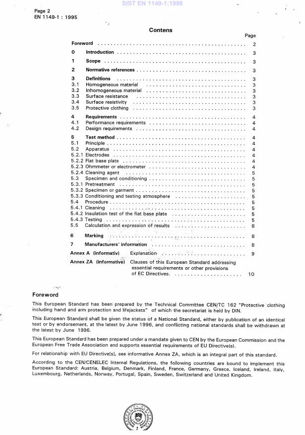 EN 1149-1:1995 is a standard published by the European Committee for Standardization (CEN). Its full title is "Protective clothing - Electrostatic properties - Part 1: Surface resistivity (Test methods and requirements)". This standard covers: This European Standard specifies electrostatic requirements and test methods for electrostatic dissipative protective clothing to avoid incendiary discharges. The requirements may not be sufficient in oxygen enriched flammable atmospheres and the test method is not applicable for fabrics with core conducting fibres. This standard is not applicable for protection against mains voltages. Note: Further information is given in the informative Annex A.