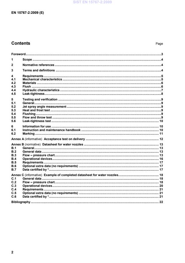 Example of completed datasheet for water nozzles. 18C.1General data . 18C.2Flow – pressure chart . 18C.3Operational devices . 20C.4Requirements . 21C.5Optional extra data (no requirements) . 21C.6Data certified by *. 21Bibliography . 22 SIST EN 15767-2:2009