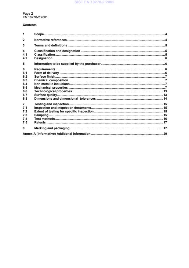 Page 2EN 10270-2:2001Contents1Scope.42Normative references.43Terms and definitions.54Classification and designation.54.1Classification.54.2Designation.65Information to be supplied by the purchaser.66Requirements.66.1Form of delivery.66.2Surface finish.76.3Chemical composition.76.4Non metallic inclusions.76.5Mechanical properties.76.6Technological properties.136.7Surface quality.136.8Dimensions and dimensional
