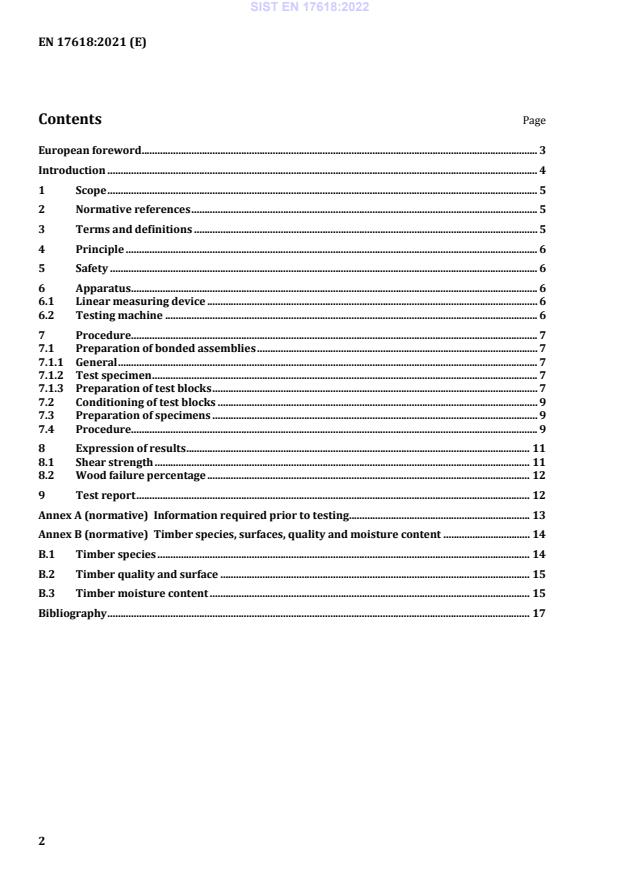 EN 17618:2021 is a standard published by the European Committee for Standardization (CEN). Its full title is "Adhesives - Wood-to-wood adhesive bonds for non-structural applications - Determination of shear strength by compressive loading". This standard covers: This document specifies a method for adhesives for wood and derived solid wood products for determining the shear strength and wood failure percentage of wood-to-wood adhesive bonds loaded in compression. These parameters allow to define different working properties of adhesives (e.g. final bond strength, pressing time, closed assembly time). Annex A gives information required prior to testing.
