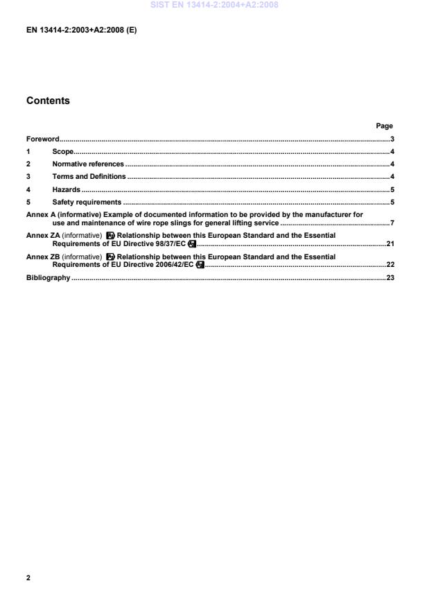 EN 13414-2:2003+A2:2008 is a standard published by the European Committee for Standardization (CEN). Its full title is "Steel wire rope slings - Safety - Part 2: Specification for information for use and maintenance to be provided by the manufacturer". This standard covers: This Part of EN 13414 specifies the information on use and maintenance to be provided by the manufacturer of wire rope slings. NOTE Certain clauses are relevant to component parts and accessories conforming to EN 1677 parts 1 to 6 Annex A is informative, and provides some of the detailed information for use and maintenance which may be appropriate for general lifting service. The hazards covered by this Part of EN13414 are identified in clause 4.