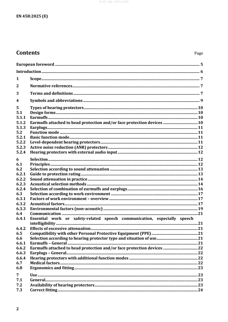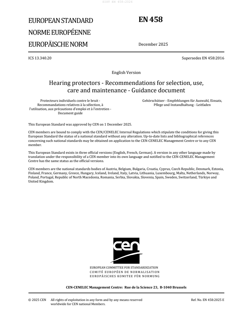 EN 458:2025 is a standard published by the European Committee for Standardization (CEN). Its full title is "Hearing protectors - Recommendations for selection, use, care and maintenance - Guidance document". This standard covers: This document gives recommendations for the selection, use, care and maintenance of hearing protectors.