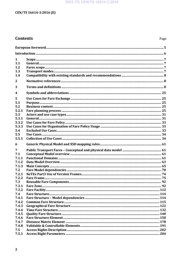 CEN/TS 16614-3:2016 is a technical specification published by the European Committee for Standardization (CEN). Its full title is "Public transport - Network and Timetable Exchange (NeTEx) - Part 3: Public transport fares exchange format". This standard covers: 1.1 General NeTEx is dedicated to the exchange of scheduled data (network, timetable and fare information). It is based on Transmodel V5.1 (EN 12986), IFOPT (EN 28701) and SIRI (CEN/TS 15531-4, CEN/TS 15531-5 and EN 15531-1, EN 15531-2, EN 15531-3 ) and supports the exchange of information of relevance for passenger information about public transport services and also for running Automated Vehicle Monitoring Systems (AVMS). NOTE NeTEx is a refinement and an implementation of Transmodel and IFOPT; the definitions and explanations of these concepts are extracted directly from the respective standard and reused in NeTEx, sometimes with adaptations in order to fit the NeTEx context. Although the data exchanges targeted by NeTEx are predominantly oriented towards provisioning passenger information systems and AVMS with data from transit scheduling systems, it is not restricted to this purpose and NeTEx can also provide an effective solution to many other use cases for transport data exchange. 1.2 Fares scope This Part 3 of NeTEx, is specifically concerned with the exchange of fare structures and fare data, using data models that relate to the underlying network and timetable models defined in Part 1 and Part 2 and the Fare Collection data model defined in Transmodel V51. See the use cases below for the overall scope of Part 3. In summary, it is concerned with data for the following purposes: (i) To describe the many various possible fare structures that arise in public transport (for example, flat fares, zonal fares, time dependent fares, distance based fares, stage fares, pay as you go fares, season passes, etc., etc.). (ii) To describe the fare products that may be purchased having these fare structures and to describe the conditions that may attach to particular fares, for example if restricted to specific groups of users, or subject to temporal restrictions. These conditions may be complex. (i) To allow actual price data to be exchanged. Note however that NeTEx does not itself specify pricing algorithms or how fares should be calculated. This is the concern of Fare Management Systems. It may be used may be used to exchange various parameters required for pricing calculations that are needed to explain or justify a fare. (iii) To include the attributes and the text descriptions necessary to present fares and their conditions of sale and use to the public. NeTEx should be regarded as being ‘upstream’ of retail systems and allows fare data to be managed and integrated with journey planning and network data in public facing information systems. It is complementary to and distinct from the ‘downstream’ ticketing and retail systems that sell fares and of the control systems that validate their use. See ‘Excluded Use Cases’ below for further information on the boundaries of NeTEx with Fare Management Systems. 1.3 Transport modes All mass public transport modes are taken into account by NeTEx, including train, bus, coach, metro, tramway, ferry, and their submodes. It is possible to describe airports, air journeys, and air fares, but there has not been any specific consideration of any additional requirements that apply specifically to air transport. 1.4 Compatibility with existing standards and recommendations The overall approach for the definition of fares within NeTEx Part 3 follows the approach used by Transmodel V5.1, namely the definition of access rights rather than of just products. This approach, used in Transmodel V5.1 (Fare Collection data model) to specify the access rights related to the urban public transport (for all urban modes) has been extended to cover access rights for long-distance rail. NOTE The concepts from Transmodel V5.1 and IFOPT used and/or modified by NeTEx are incorporated into Transmodel V6 to guarantee compatibility and coherence of standards.