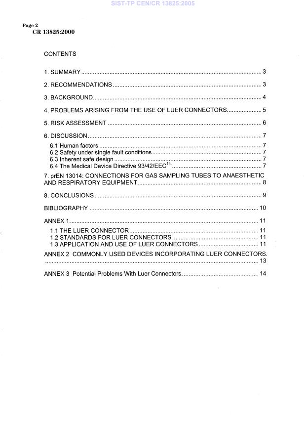 CR 13825:2000 is a technical report published by the European Committee for Standardization (CEN). Its full title is "Luer connectors - A report to CEN chef from the CEN forum task group "Luer fittings"". This standard covers: Luer connectors are used in medical devices with a wide range of functions, raising the possibility of accidental cross connection between devices. We assessed the hazards arising from accidental misconnection, and reviewed adverse incidents known to have involved Luer connectors. We considered three possible strategies for reducing the risk of misconnection being made: 1) The use of different male/female sequences for different applications. 2) The use of colour coding. 3) The restriction of the applications for which the use of Luer connectors is permitted. Only the last of these offered real benefits.