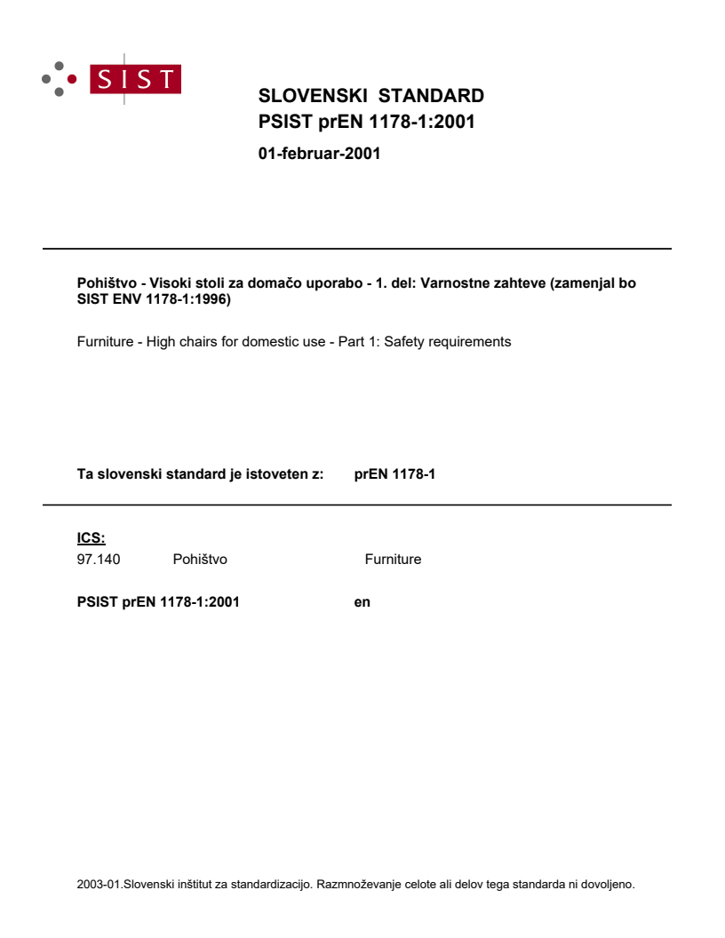 Pohištvo - Visoki stoli za domačo uporabo - 1. del: Varnostne zahteve (zamenjal bo SIST ENV 1178-1:1996)