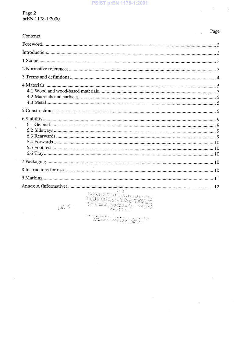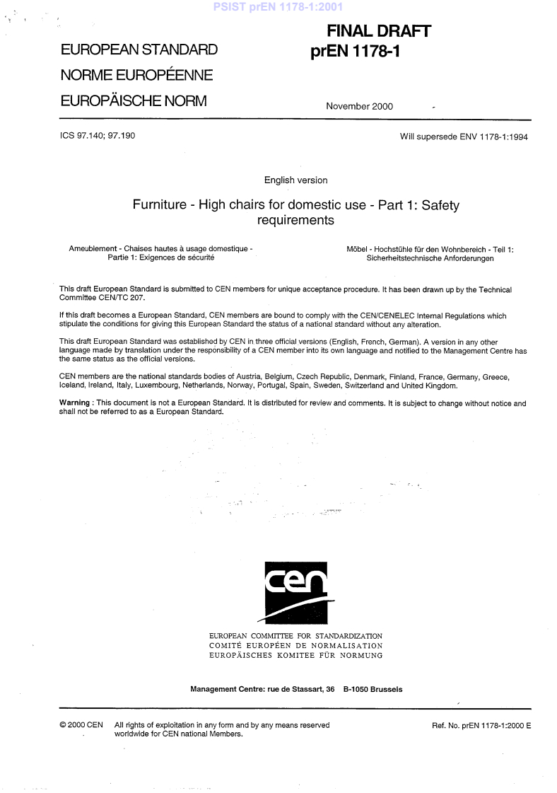 prEN 1178-1 is a draft published by the European Committee for Standardization (CEN). Its full title is "Furniture - High chairs for domestic use - Part 1: Safety requirements". This standard covers: This part of EN 1178 specifies safety requirements for children's high chairs for domestic use. Such chairs may be convertible to products with other functions. These additional functions are not covered by this standard. Annex A includes information on the required back rest height, harness/belt and attachment points in the CEN member countries.