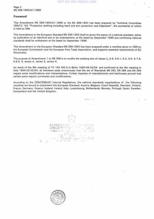 EN 399:1993/A1:1998 has the following relationships with other standards: It is inter standard links to EN ISO 12402-2:2006, EN 399:1993. Understanding these relationships helps ensure you are using the most current and applicable version of the standard.