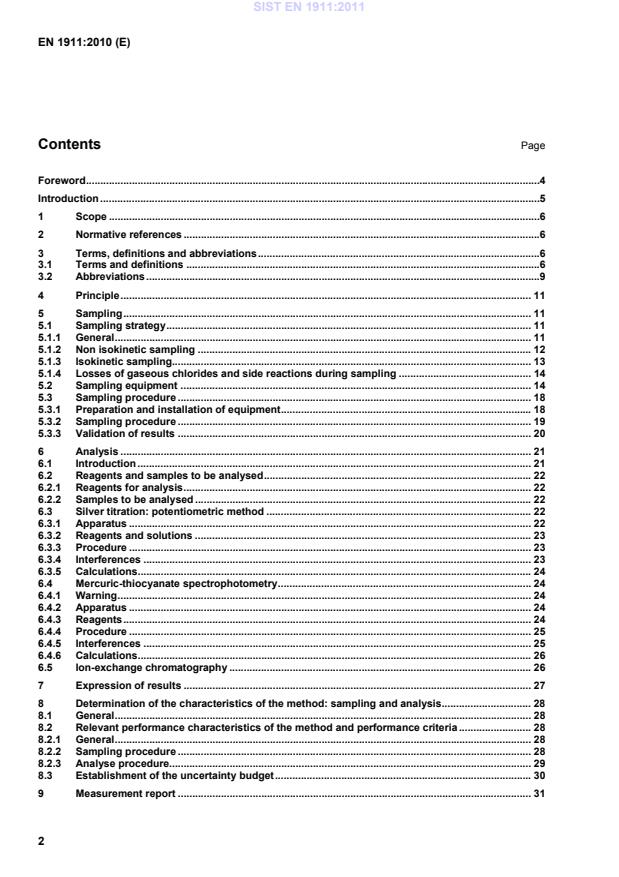 NOTE 2 The required uncertainty results from the capacity of the method tested in the field (Annex D) and in the laboratory (see performance characteristics in Tables 1 and 2 and Annex C). 2 Normative references The following referenced documents are indispensable for the application of this document. For dated references, only the edition cited applies. For undated references, the latest edition of the referenced document (including any amendments) applies. EN 13284-1:2001, Stationary source emissions — Determination of low range mass concentration of dust — Part 1: Manual gravimetric method ENV 13005, Guide to the expression of uncertainly in measurement EN 15259:2007, Air quality — Measurement of stationary source emissions — Requirements for measurement sections and sites and for the measurement objective, plan and report EN ISO 3696:1995, Water for analytical laboratory use — Specification and test methods (ISO 3696:1987) EN ISO 10304-1, Water quality — Determination of dissolved anions by liquid chromatography of ions — Part 1: Determination of bromide, chloride, fluoride, nitrate, nitrite, phosphate and sulfate (ISO 10304-1:2007) EN ISO 14956, Air quality — Evaluation of the suitability of a measurement procedure by comparison with a required measurement uncertainty (ISO 14956:2002) 3 Terms, definitions and abbreviations 3.1 Terms and definitions For the purposes of this document, the following terms and definitions apply. 3.1.1 absorber device in which gaseous chloride is absorbed into an absorption solution 3.1.2 chemical blank chloride ion content of an unexposed sample of the absorption solution, plus reagents that are added to the solution before analysis if necessary SIST EN 1911:2011