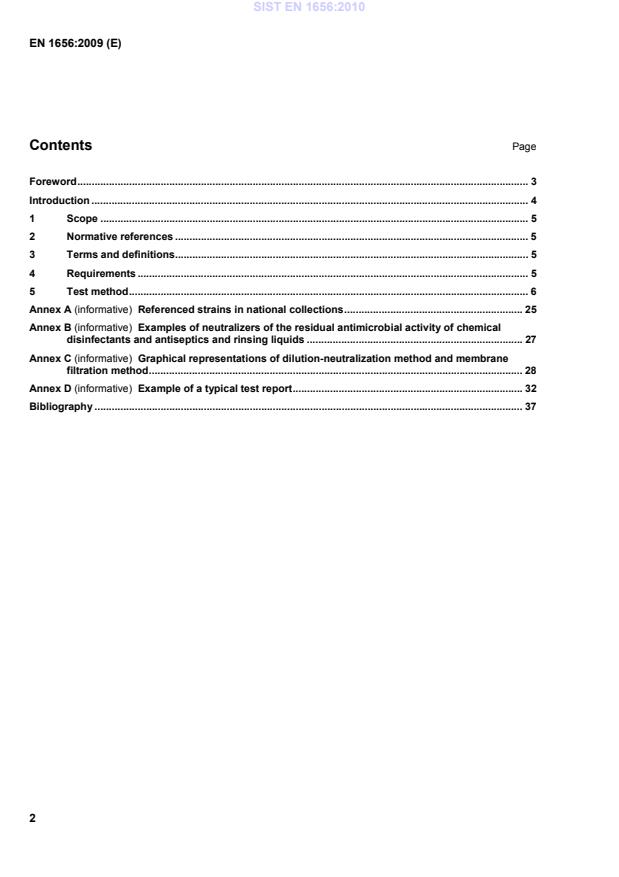 This European Standard applies to products that are used in the veterinary area – e.g. in the breeding, husbandry, transport and disposal of all animals except when in the food chain following death and entry to the processing industry. EN 14885 specifies in detail the relationship of the various tests to one another and to “use recommendations”. NOTE 1 The method described is intended to determine the activity of commercial formulations or active substances under the conditions in which they are used. NOTE 2 This method corresponds to a phase 2 step 1 test. 2 Normative references The following referenced documents are indispensable for the application of this document. For dated references, only the edition cited applies. For undated references, the latest edition of the referenced document (including any amendments) applies. EN 12353, Chemical disinfectants and antiseptics — Preservation of test organisms used for the determination of bactericidal, mycobactericidal, sporicidal and fungicidal activity EN 14885:2006, Chemical disinfectants and antiseptics — Application of European Standards for chemical disinfectants and antiseptics 3 Terms and definitions For the purposes of this document, the terms and definitions given in EN 14885:2006 apply. 4 Requirements The product shall demonstrate at least a five-decimal log (lg) reduction when diluted with hard water (5.2.2.7) or – in the case of ready-to-use products – with water (5.2.2.2) and tested in accordance with Clause 5 under simulated low-level soiling (3,0 g/l bovine albumin solution – 5.2.2.8.2) or simulated high-level soiling (10 g/l bovine albumin solution and 10 g/l yeast extract – 5.2.2.8.3) (or 10 g/l skimmed milk for teat disinfectants – 5.2.2.8.4) according to its practical applications and under the other obligatory test conditions four or three [for teat disinfectants] selected test organisms, 10 °C [30 ûC for teat disinfectants], 30 min [5 min for teat disinfectants]). The bactericidal activity shall be evaluated using the following organisms: a) Products for general disinfection: b) Teat disinfectants: Enterococcus hirae; Escherichia coli; Proteus vulgaris; Staphylococcus aureus; Pseudomonas aeruginosa; Streptococcus uberis. SIST EN 1656:2010