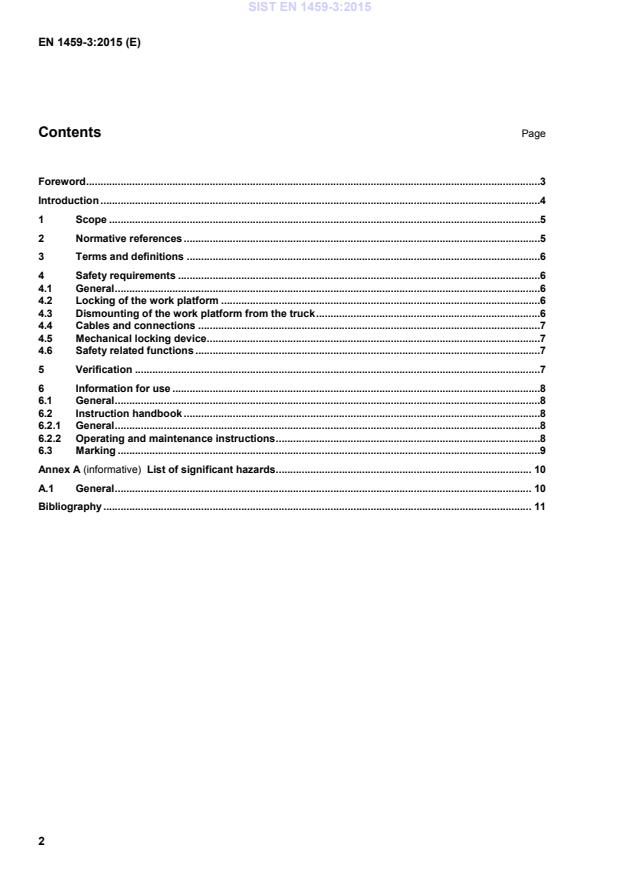 Foreword .3 Introduction .4 1 Scope .5 2 Normative references .5 3 Terms and definitions .6 4 Safety requirements .6 4.1 General .6 4.2 Locking of the work platform .6 4.3 Dismounting of the work platform from the truck .6 4.4 Cables and connections .7 4.5 Mechanical locking device .7 4.6 Safety related functions .7 5 Verification .7 6 Information for use .8 6.1 General .8 6.2 Instruction handbook .8 6.2.1 General .8 6.2.2 Operating and maintenance instructions .8 6.3 Marking .9 Annex A (informative)