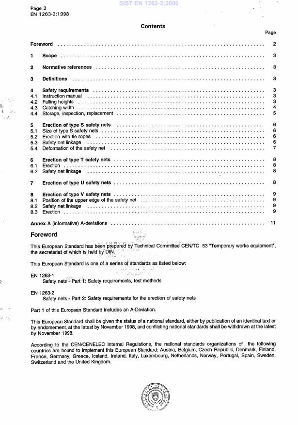 EN 1263-2:1998 is a standard published by the European Committee for Standardization (CEN). Its full title is "Safety nets - Part 2: Safety requirements for the erection of safety nets". This standard covers: This European Standard specifies safety requirements for the erection of safety nets in accordance with the manufacturer's instruction manual and with the product specifications and for the testing of type S, type T, type U and type V safety nets in accordance with EN 1263-1. Small safety nets of type S according to EN 1263-1 (less than 35 m2 and 5,0 m on the shortest side) are not dealt with in this European Standard.