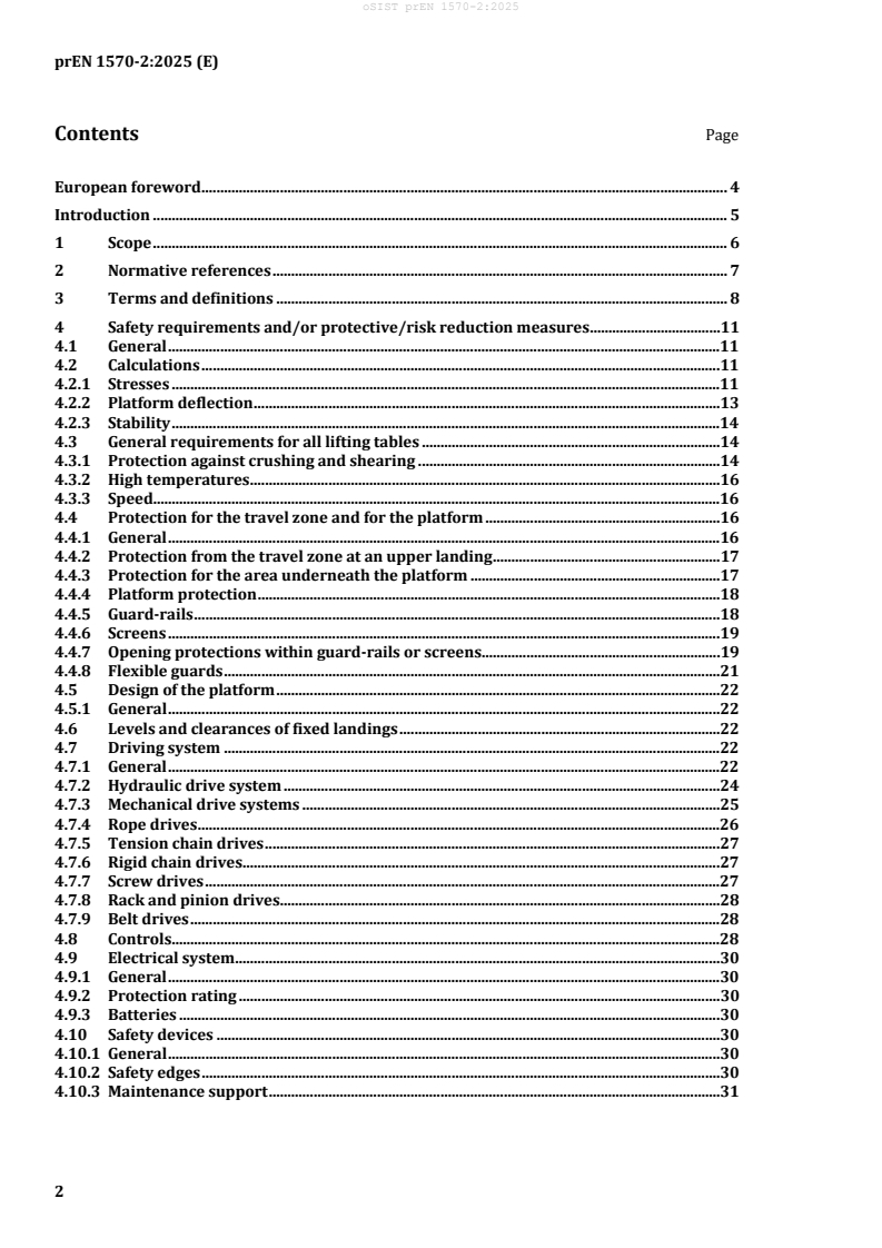 FprEN 1570-2 is a European standard developed by CEN that specifies the safety requirements for lifting tables designed to serve more than two fixed landings within a building. These lifting tables are intended exclusively for lifting goods - not persons - and operate at a vertical travel speed not exceeding 0.15 m/s. The standard targets permanently installed lifting tables which are accessible to persons only during loading and unloading phases. It supersedes the previous EN 1570-2:2016 and aligns with updated safety practices and technical requirements.