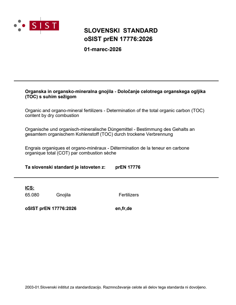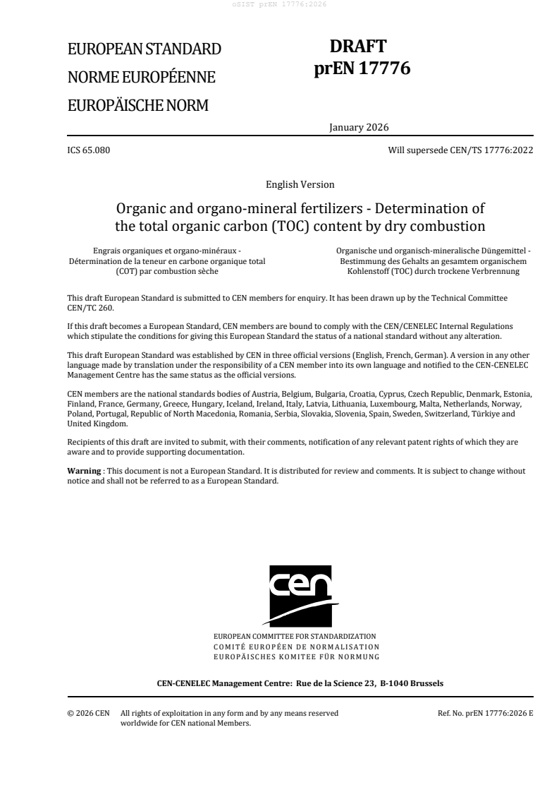 prEN 17776 is a draft published by the European Committee for Standardization (CEN). Its full title is "Organic and organo-mineral fertilizers - Determination of the total organic carbon (TOC) content by dry combustion". This standard covers: This document specifies a method for the determination of total organic carbon (TOC) by elemental analysis using dry combustion. The method is applicable to organic and organo-mineral fertilizers containing more than 1 g carbon per kg of dry matter (0,1 %), with the exclusion of organo-mineral fertilizers containing urea-formaldehyde polymers or urea as long as there is no method available to assess carbon in urea-formaldehyde polymers or urea. This document is applicable to the component materials “by-products”, or “recovered high-purity materials”, when used as components of fertilizing products, as well as the fertilizing products blends where a blend is a mix of at least two of the following components: fertilizers, liming materials, soil improvers, growing media, inhibitors, plant biostimulants and where the following category: organic fertilizers, organo-mineral fertilizers is the highest % in the blend by mass or volume, or in the case of liquid form by dry mass. If the organic fertilizer or the organo-mineral fertilizer is not the highest % in the blend, the European Standard for the highest % of the blend applies. In case a fertilizing product blend is composed of components in equal quantity, the user decides which standard to apply. Variations in analytical methods for fertilizing product blends can lead to differing results as some components or matrix interactions can affect the outcome. Validation procedures have shown that developed standard methods are robust and reliable across diverse product compositions, but possible interferences and unexpected results when analysing fertilizing product blends are possible. This document is applicable and validated for several types of matrices as indicated in Annex B.