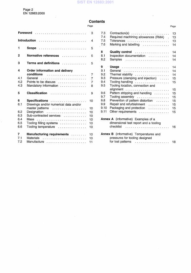 이 기사는 EN 12883:2000 표준에 대해 논의합니다. 이 표준은 잃어버린 왁스 주조 공정용 잃어버린 패턴의 생산을 위한 툴링에 대한 요구 사항을 명시합니다. 이 표준은 용해 왁스 코어 및 세라믹 코어의 생산도 다룹니다. 그러나 Shaw 공정에 의한 주조에 사용되는 장비는 다루지 않습니다. 또한, 이 표준은 체형형성 또는 소결 왁스 공정 또는 적층 물체 제조 (LOM)와 같은 수치 자료를 사용하여 잃어버린 패턴을 직접 생성하는 특정 공정을 명시하지 않습니다.