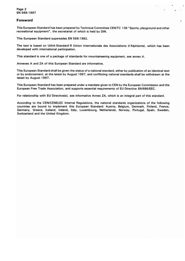 EN 569:1997 is a standard published by the European Committee for Standardization (CEN). Its full title is "Mountaineering equipment - Pitons - Safety requirements and test methods". This standard covers: This European Standard specifies requirements and test methods for pitons for use in mountaineering including climbing.