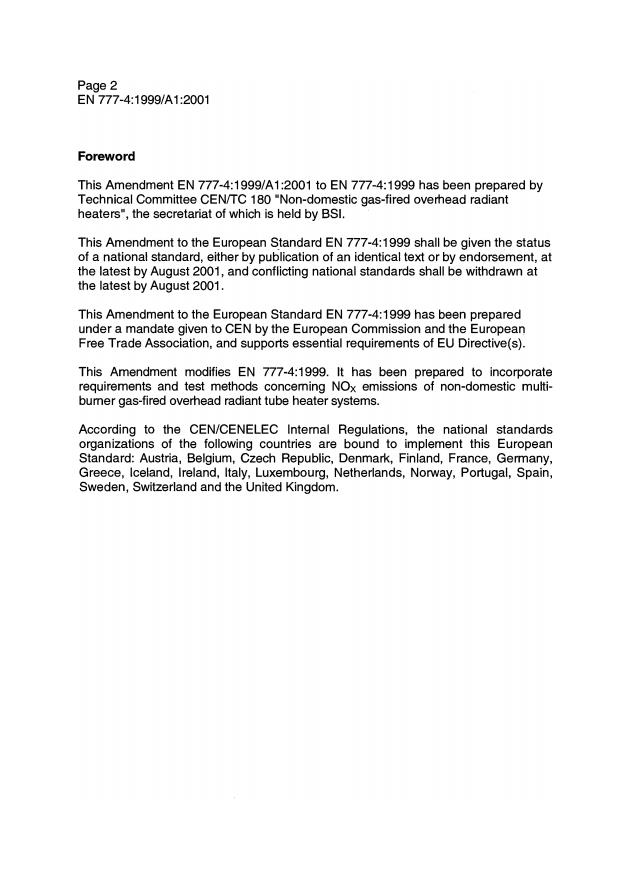 This amendment modifies EN 777-4:1998. It has been prepared to incorporate requirements and test methods concerning NOx emissions of non-domestic gas-fired overhead radiant tube heaters.