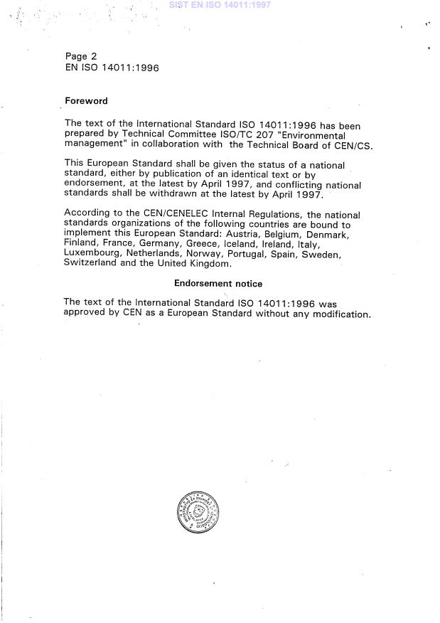 EN ISO 14011:1996 is a standard published by the European Committee for Standardization (CEN). Its full title is "Guidelines for environmental auditing - Audit procedures - Auditing of environmental management systems (ISO 14011:1996)". This standard covers: To be replaced by EN ISO 19011 (CSF20041) (NT/2001-09-14).