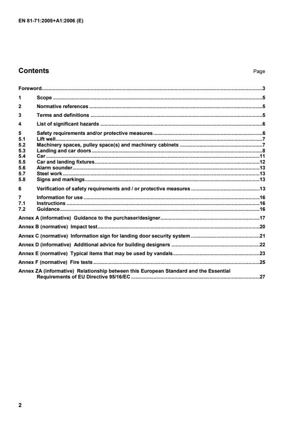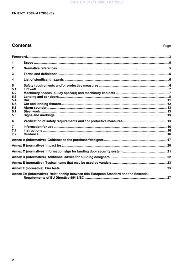 EN 81-71:2005+A1:2006 is a standard published by the European Committee for Standardization (CEN). Its full title is "Safety rules for the construction and installation of lifts - Particular applications to passenger lifts and goods passenger lifts - Part 71: Vandal resistant lifts". This standard covers: This document gives additional and deviating requirements to EN 81-1 and EN 81-2 as applicable in order to ensure the safety of lift users and the availability of lifts, which may be used for vandal resistant purposes. In all other respects such lifts are designed in accordance with EN 81-1, including Amendment A2 or EN 81-2, including Amendment A2. This document deals with the significant hazards, hazardous situations and events relevant to lifts which can be affected by vandalism (as listed in Clause 4) when they are used under the conditions as foreseen by the installer. It does not cover building security or Category O lifts (see definition 3.2).