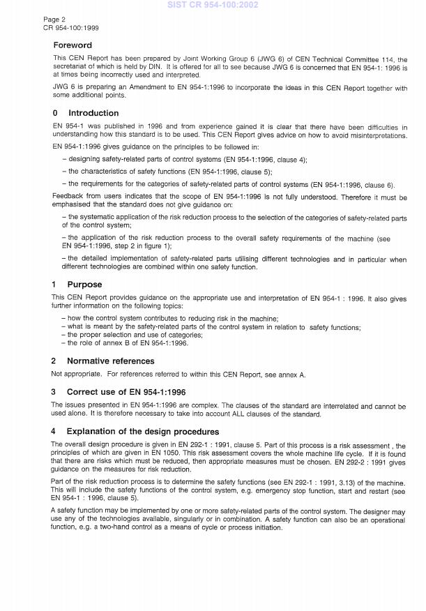CR 954-100:1999 is a standardization document published by the European Committee for Standardization (CEN). Its full title is "Safety of machinery - Safety-related parts of control systems - Part 100: Guide on the use and application of EN 954-1:1996". This standard covers: This CEN Report provides guidance on the appropriate use and interpretation of EN 954-1:1996. It also gives further information on the following topics: - how the control system contributes to reducing risk in the machine; - what is meant by the safety-related parts of the control system in relation to safety functions; - the proper selection and use of the categories; - the role of annex B of EN 954-1:1996.