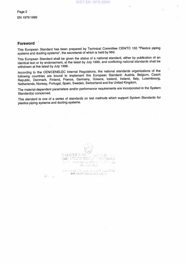 EN 1979:1999 is a standard published by the European Committee for Standardization (CEN). Its full title is "Plastics piping and ducting systems - Thermoplastics spirally-formed structured-wall pipes - Determination of the tensile strength of a seam". This standard covers: This standard specifies a method for determining the tensile strength of a seam in a spirally- formed thermoplastics pipe. It is applicable to all such thermoplastics pipes, regardless of their intended use.
