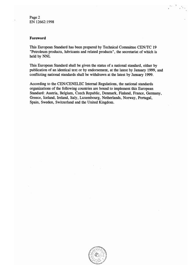 EN 12662:1998 is a standard published by the European Committee for Standardization (CEN). Its full title is "Liquid petroleum products - Determination of contamination in middle distillates". This standard covers: This European Standard specifies a method for determining contamination as the content of undissolved substances in middle distillates, expressed as a mass fraction in milligrams/kilogram. Note: Contaminants can give rise to faults, for example the blocking of filters, and their presence is therefore undesirable. This standard applies to liquid petroleum products having a kinematic viscosity not exceeding 8 mm2/s at 20°C, or 5 mm2/s at 40°C, e.g. diesel fuel as specified in EN 590 1) or light fuel oils.