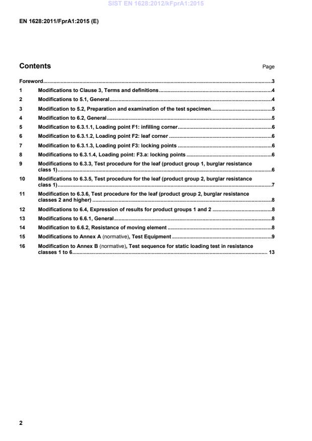 EN 1628:2011/FprA1 is a draft published by the European Committee for Standardization (CEN). Its full title is "Pedestrian doorsets, windows, curtain walling, grilles and shutters - Burglar resistance - Test method for the determination of resistance under static loading". This standard covers: This European Standard specifies a test method for the determination of resistance to static loading in order to assess the burglar resistant properties of pedestrian door sets, windows, curtain walling, grilles and shutters. It is applicable to the following means of opening: Turning, tilting, folding, turn-tilting, top or bottom hung, sliding (horizontally and vertically) and rolling as well as fixed constructions. This European Standard does not apply to doors, gates and barriers, intended for installation in areas in the reach of persons, and for which the main intended uses are giving safe access for goods and vehicles accompanied or driven by persons in industrial, commercial or residential premises, as covered by EN 13241-1.