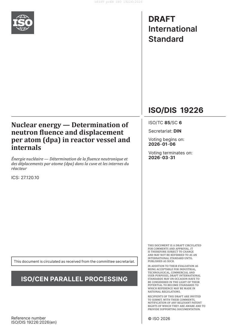 Nuclear energy - Determination of neutron fluence and displacement per atom (dpa) in reactor vessel and internals (ISO/DIS 19226:2026)