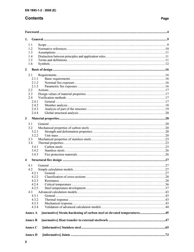 Foreword.4 1. General.9 1.1 Scope.9 1.2 Normative references.10 1.3 Assumptions.11 1.4 Distinction between principles and application rules.11 1.5 Terms and definitions.11 1.6 Symbols.12 2 Basis of design.16 2.1 Requirements.16 2.1.1 Basic requirements.16 2.1.2 Nominal fire exposure.16 2.1.3 Parametric fire exposure.16 2.2 Actions.17 2.3 Design values of material properties.17 2.4 Verification methods.17 2.4.1 General.17 2.4.2 Member analysis.18 2.4.3 Analysis of part of the structure.19 2.4.4 Global structural analysis.20 3 Material properties.20 3.1 General.20 3.2 Mechanical properties of carbon steels.20 3.2.1 Strength and deformation properties.20 3.2.2 Unit mass.20 3.3 Mechanical properties of stainless steels.23 3.4 Thermal properties.23 3.4.1 Carbon steels.23 3.4.2 Stainless steels.26 3.4.3 Fire protection materials.26 4 Structural fire design.27 4.1 General.27 4.2 Simple calculation models.27 4.2.1 General.27 4.2.2 Classification of cross-sections.28 4.2.3 Resistance.28 4.2.4 Critical temperature.36 4.2.5 Steel temperature development.37 4.3 Advanced calculation models.43 4.3.1 General.43 4.3.2 Thermal response.43 4.3.3 Mechanical response.43 4.3.4 Validation of advanced calculation models.44 Annex A [normative] Strain-hardening of carbon steel at elevated temperatures.45 Annex B [normative] Heat transfer to external steelwork.47 Annex C