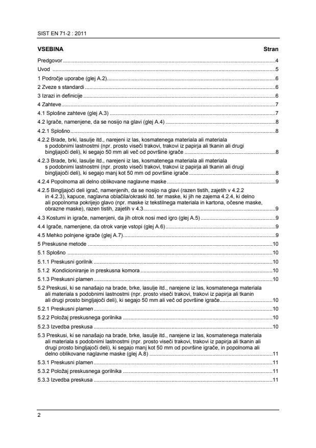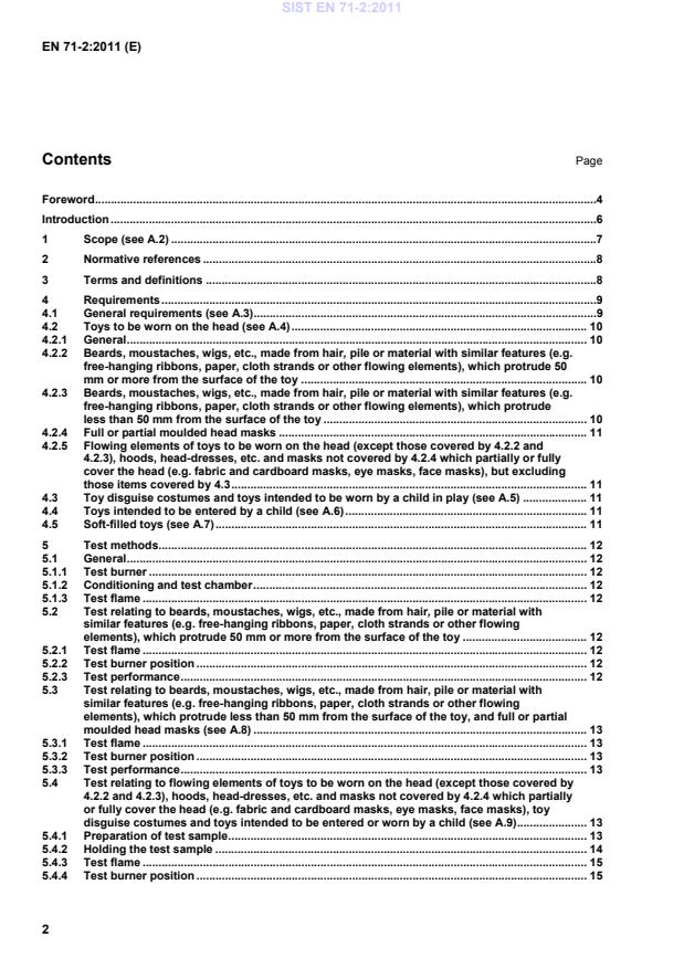 EN 71-2:2011 is a standard published by the European Committee for Standardization (CEN). Its full title is "Safety of toys - Part 2: Flammability". This standard covers: This European Standard specifies the categories of flammable materials which are prohibited in all toys, and requirements concerning flammability of certain toys when they are subjected to a small source of ignition. The test methods described in Clause 5 are used for the purposes of determining the flammability of toys under the particular test conditions specified. The test results thus obtained cannot be considered as providing an overall indication of the potential fire hazard of toys or materials when subjected to other sources of ignition. This European Standard includes general requirements relating to all toys and specific requirements and methods of test relating to the following toys, which are considered as being those presenting the greatest hazard: - toys to be worn on the head: beards, moustaches, wigs, etc. made from hair, pile or material with similar features; masks; hoods, head-dresses, etc.; flowing elements of toys to be worn on the head, but excluding paper novelty hats of the type usually supplied in party crackers; - toy disguise costumes and toys intended to be worn by a child in play; - toys intended to be entered by a child; - soft-filled toys. NOTE Additional requirements for flammability of electric toys are specified in EN 62115.