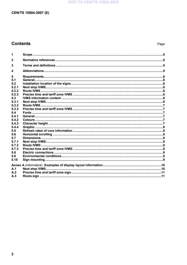 CEN/TS 15504:2007 is a European technical specification developed by CEN to standardize visible variable passenger information devices (Interior Variable Message Signs - IVMS) inside public transport road vehicles such as buses, tramways, and trolleybuses. This standard specifies requirements for the installation location, dimensions, characteristics, information content, and electrical connections of IVMS. Technologies like LCD, LED, and VFD displays are supported, focusing on passenger information clarity and system interoperability within vehicle environments.