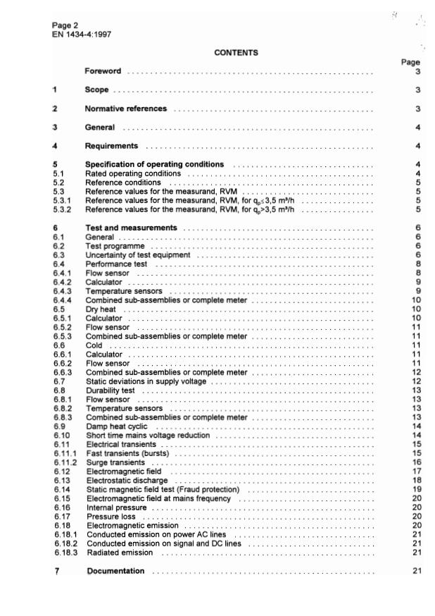 EN 1434-4:1997 is a standard published by the European Committee for Standardization (CEN). Its full title is "Heat meters - Part 4: Pattern approval tests". This standard covers: This European Standard applies to heat meters, that is to instruments intended for measuring the heat which, in a heat-exchange circuit, is absorbed or given up by a liquid called the heat-conveying liquid. The meter indicates heat quantity in legal units. Electrical safety requirements are not covered by this standard. Meters with surface mounted temperature sensors are not yet included in this standard. Part 4 specifies pattern approval tests.