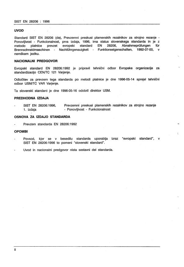 EN 28206:1992 is a standard + national annex and/or foreword published by the European Committee for Standardization (CEN). Its full title is "Acceptance tests for oxygen cutting machines - Reproducible accuracy - Operational characteristics (ISO 8206:1991)". This standard covers: This international Standard applies to stationary cross-carriage oxygen cutting machines for shape cutting and/or parallel trimming. It also applies to machines for cutting by other thermal processes.