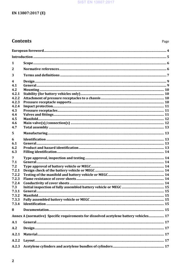 Specific requirements for dissolved acetylene battery vehicles . 17 A.1 General . 17 A.2 Design . 17 A.2.1 Material . 17 A.2.2 Layout . 17 A.2.3 Acetylene cylinders and acetylene bundles of cylinders . 17 SIST EN 13807:2017