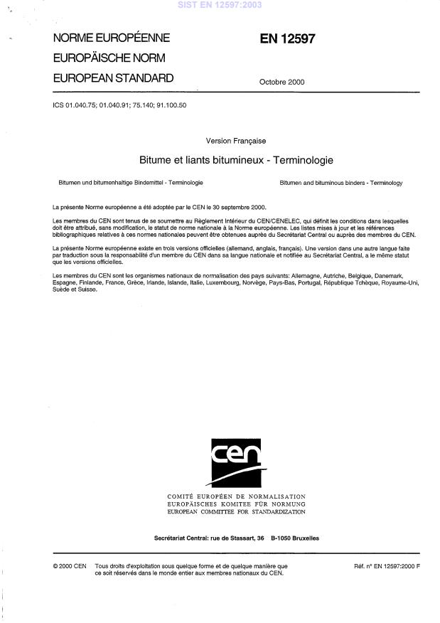 EN 12597:2000 is a standard published by the European Committee for Standardization (CEN). Its full title is "Bitumen and bituminous binders - Terminology". This standard covers: This European Standard defines terms for bitumen of various types and binders derived from bitumen. Should this standard be intended to cover materials only within the scope of TC 19, i.e. only petroleum-derived materials, it should con sequently not extend to non-petroleum "hydrocarbon" binders such as coal tar andits derivatives or to natural asphalts. However, some definitions are given for some excluded materials and related terms. The corresponding terms were introduced only when they appeared in a definition of a product or process and when their definition was found necessary for understanding or for avoiding any ambiguity