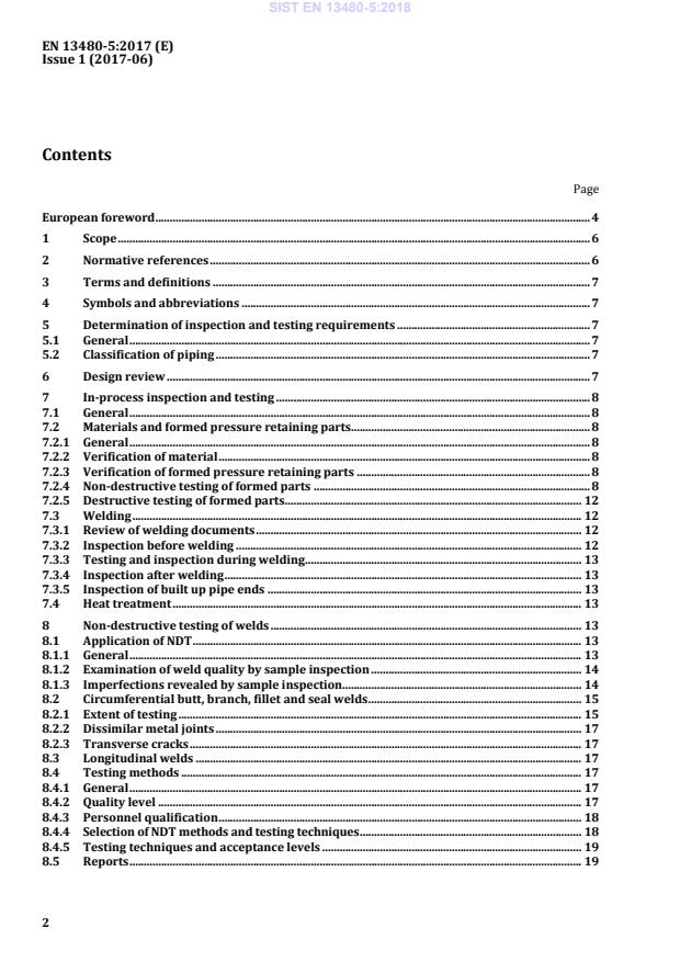 EN13480æ5:2017(E)Issue1(2017æ06)2ContentsFPageFEuropeanforeword.4 1Scope.6 2Normativereferences.6 3Termsanddefinitions.7 4Symbolsandabbreviations.7 5Determinationofinspectionandtestingrequirements.7 5.1General.7 5.2Classificationofpiping.7 6Designreview.7 7Inæprocessinspectionandtesting.8 7.1General.8 7.2Materialsandformedpressureretainingparts.8 7.2.1General.8 7.2.2Verificationofmaterial.8 7.2.3Verificationofformedpressureretainingparts.8 7.2.4Nonædestructivetestingofformedparts.8 7.2.5Destructivetestingofformedparts.12 7.3Welding.12 7.3.1Reviewofweldingdocuments.12 7.3.2Inspectionbeforewelding.12 7.3.3Testingandinspectionduringwelding.13 7.3.4Inspectionafterwelding.13 7.3.5Inspectionofbuiltuppipeends.13 7.4Heattreatment.13 8Nonædestructivetestingofwelds.13 8.1ApplicationofNDT.13 8.1.1General.13 8.1.2Examinationofweldqualitybysampleinspection.14 8.1.3Imperfectionsrevealedbysampleinspection.14 8.2Circumferentialbutt,branch,filletandsealwelds.15 8.2.1Extentoftesting.15 8.2.2Dissimilarmetaljoints.17 8.2.3Transversecracks.17 8.3Longitudinalwelds.17 8.4Testingmethods.17 8.4.1General.17 8.4.2Qualitylevel.17 8.4.3Personnelqualification.18 8.4.4SelectionofNDTmethodsandtestingtechniques.18 8.4.5Testingtechniquesandacceptancelevels.19 8.5Reports.19 SIST EN 13480-5:2018