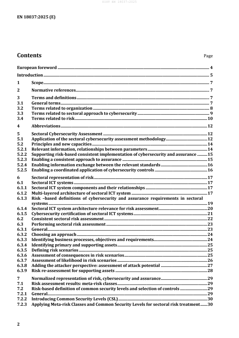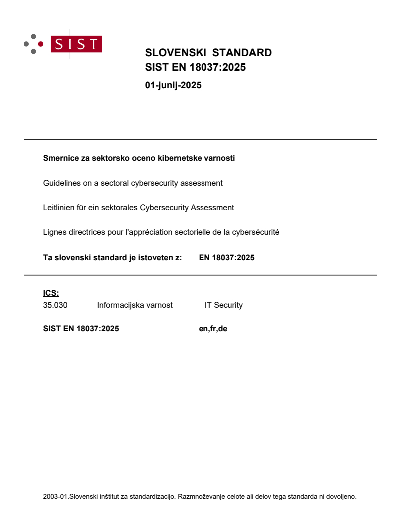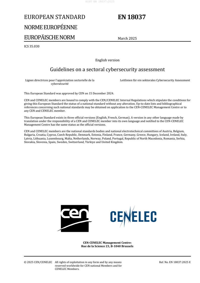 EN 18037:2025 is a standard published by the European Committee for Standardization (CEN). Its full title is "Guidelines on a sectoral cybersecurity assessment". This standard covers: This document contains guidelines to be used in the process of drafting requirements of cybersecurity certification schemes for sectoral ICT services and systems. It includes all steps necessary to define, implement and maintain such requirements.