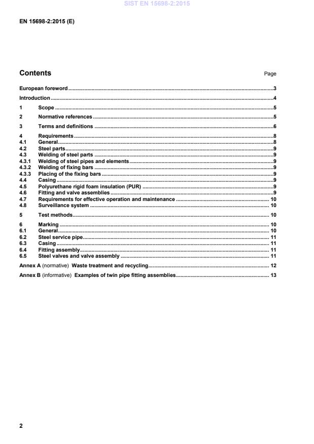 2003-01.Slovenski inštitut za standardizacijo. Razmnoževanje celote ali delov tega standarda ni dovoljeno.ãþDFernwärmerohre - Werkmäßig gedämmte Verbundmanteldoppelrohre für direkt erdverlegte Fernwärmenetze - Teil 2: Verbundformstück und vorgedämmte Absperrarmatur, bestehend aus Stahl-Mediumrohr, Polyurethan-Wärmedämmung und Außenmantel aus PolyethylenTuyaux de chauffage urbain - Systèmes bloqués de tuyaux pré-isolés pour les réseaux d'eau chaude directement enterrés - Partie 2: Assemblages de raccords et d'appareils de robinetterie pour tubes de service en acier, isolation thermique en polyuréthane et protection extérieure unique en polyéthylèneDistrict heating pipes - Preinsulated bonded twin pipe systems for directly buried hot water networks - Part 2: Fitting and valve assembly of steel service pipes, polyurethane thermal insulation and outer casing of polyethylene91.140.10Sistemi centralnega ogrevanjaCentral heating systems23.040.10Železne in jeklene ceviIron and steel pipesICS:Ta slovenski standard je istoveten z:EN 15698-2:2015SIST EN 15698-2:2015en,fr,de01-oktober-2015SIST EN 15698-2:2015SLOVENSKI