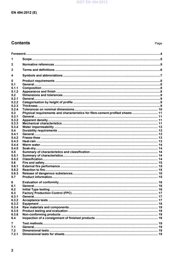 EN 494:2012 is a standard published by the European Committee for Standardization (CEN). Its full title is "Fibre-cement profiled sheets and fittings - Product specification and test methods". This standard covers: This European Standard specifies the technical requirements and establishes methods of control and test as well as acceptance conditions for fibre-cement profiled sheets and their fibre-cement fittings for one or more of the following uses: - roofing; - internal wall finishes; - external wall and ceiling finishes. For the purpose of this European Standard, fibre-cement profiled sheets are classified according to their height of corrugation and their mechanical characteristics. This European Standard covers fibre-cement profiled sheets reinforced with fibres of different type as specified in 5.1.1, with and without factory applied coating. This European Standard does not include calculations with regard to works, design requirements, installation techniques, wind uplift or rain proofing of the installed sheets. NOTE Some of these requirements can be applied, after agreement, to curved sheets for specific applications.